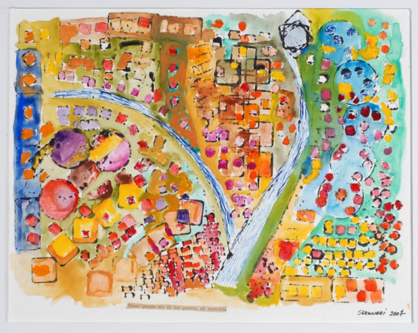 empreintes are created with various objects found in my atelier. I use these objects to create stamps; bottle tops, glass fragments, computer keys, wax forms, electrical connectors, kitchen utensils, rollers, straight edges are coupled with inks, gouache, and acrylic paints in repeating patterns. Many have titles taken from the script of Fellini's "Juliette of the Spirits", others formed from science and sensor technologies.
